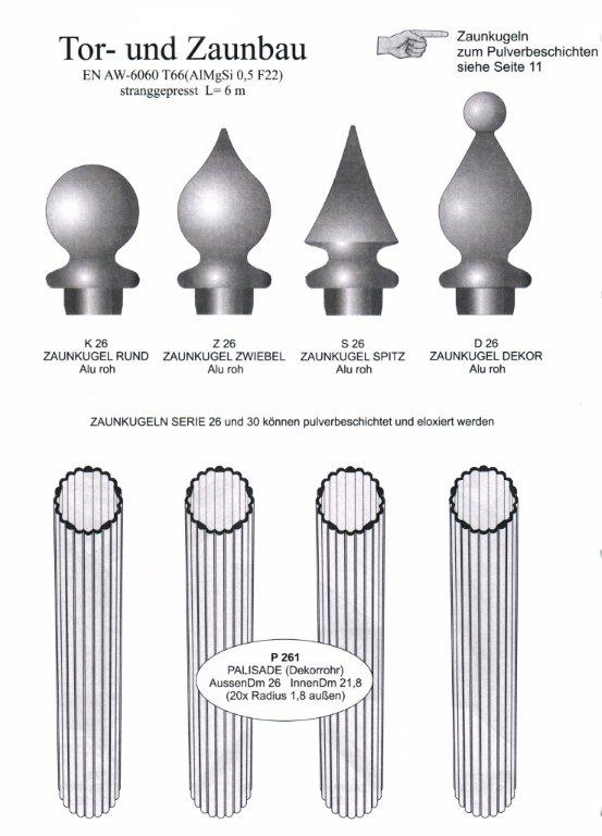 - Palisadenzaunanlagen lassen sich aus unserem profilierten Formrohr mit den Abmaßen 26 bzw. 30 mit den unterschiedlichsten Abdeckungen (Zwiebel, Kugel, Spitze etc. gestalten